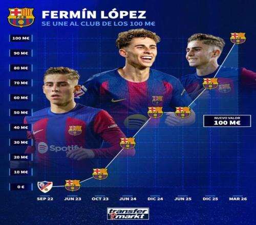 费尔明-洛佩斯在2022年9月的时候身价是5万欧元。到了2023年10月,他的身价已经上涨到800万欧元。在2023年12月,他的身价上涨到1500万欧元。在2024年10月,他的身价上涨到5000万欧元。在2025年12月,他的身价涨到7000万欧元。而现在他的身价达到1亿欧元。不到4年的时间,他的身价上涨幅度太惊人了!