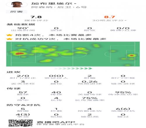 加布里埃尔本场数据:5次解围,4次抢断,10对抗9成功,2射门_24直播网