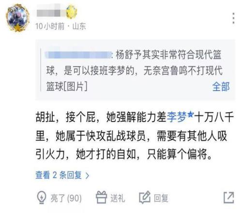 然而对于杨舒予在世预赛中规中矩的表现,球迷并不买账:“她强解能力差李梦十万八千里,属于快攻乱战球员,需要有其他人吸引火力,她才打的自如,只能算个偏将”、“男篮有杨溢、崔永熙,现在又来个你,广东盛产领袖啊”、“她姐在黄金一代只能算还可以,不能指望她们发生什么质变,所以一点也不看好她们打强队。”