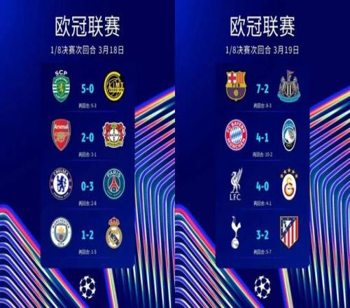 北京时间3月19日,欧冠1/8决赛次回合最后四次对决结束。本轮,英超球队遭遇重创,切尔西、曼城分别遭巴黎、皇马双杀出局,热刺虽主场险胜马竞仍填客场惨败大坑,首回合主场战平巴萨的纽卡斯尔联则在客场2比7惨遭屠戮——除阿森纳轻取勒沃库森获得晋级门票外,仅利物浦主场四球大胜加拉塔萨雷逆转总比分晋级;西甲三强则全部晋级8强,展现底蕴;葡萄牙体育常规时间3比0、总比分3比3战平博德闪耀进入加时赛,加时赛葡体再进2球,完成神奇逆转送黑马出局;拜仁则再送意甲独苗亚特兰大一场惨败,总比分10比2轻松过关。