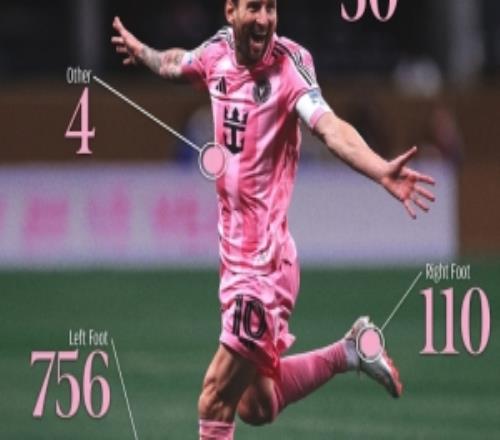 梅西900球进球部位分布:左脚756球,右脚110球,头球30球