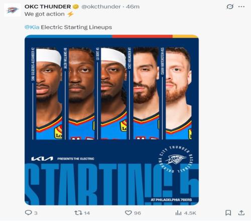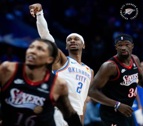 次节雷霆的第二阵容都吊打费城的第一阵容,麦凯恩登场时费城球迷为他响起欢呼声,这是他被交易到OKC后首次回到费城主场打球。替补席的杰林2分钟里命中三个三分球拿到9分,单节雷霆一波30-18打崩费城,SGA半场只拿到11分2篮板2助攻但分差已经是20+。